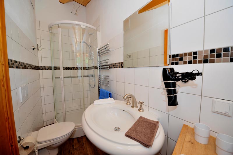 - Badezimmer mit Duschkabine, Waschbecken, WC, Föhn